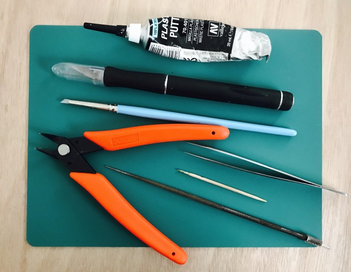 So: knife, file, magnifier, light, putty, primer, file, tweezers, snips… Glue.